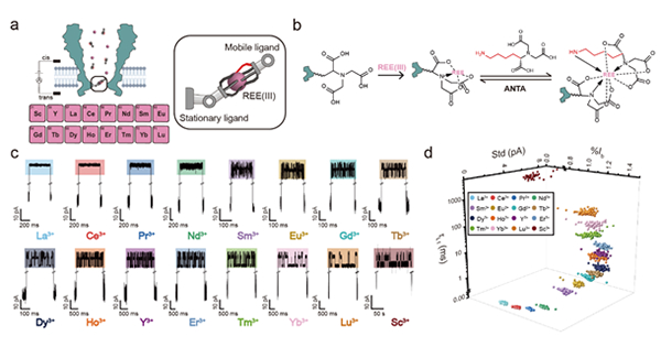 图 (a-b) 基于双配体策略的工程化MspA纳米孔检测稀土原理示意图;(c) 16种稀土的单分子纳米孔信号;(d) 16种稀土的纳米孔信号的散点图展示