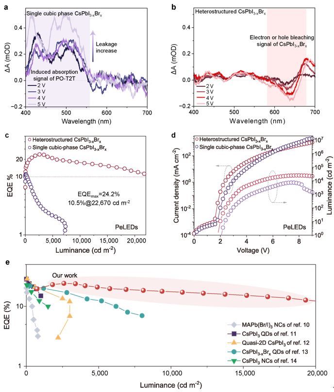 通过构建三维CsPbI3-xBrx异质结发光层,纯红钙钛矿LED器件的空穴泄漏得到了有效抑制 (图3a,b)。相应器件的峰值外量子效率(EQE)达到24.2%,最大亮度为24,600 cd m-2(图3c,d)。并且器件展现出非常低的效率滚降——亮度为22,670 cd m-2时,器件依然具有超过10%的EQE,这优于以往报道的结果(图3e)。该工作的研究结果展现出三维钙钛矿异质结材料设计在发展高效、明亮且稳定钙钛矿LED方面的巨大潜力。