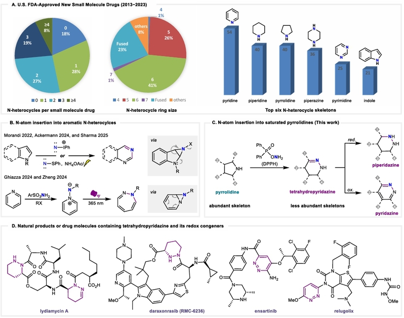 含氮杂环化合物(N-杂环)是医药化学中最重要且多功能的骨架之一,是调节分子识别、药物动力学以及理化性质的关键元素。最常见的骨架包括六元的吡啶和哌啶,五元的吡咯烷等(图1A)。鉴于它们的广泛性和结构多样性,开发直接编辑N-杂环的策略具有实际意义。最近,多个课题组利用π键活化路径对N-杂芳香族体系的氮插入反应研究并取得了非常出色的成果(图1B);但直接向饱和氮杂环插入氮原子形成二氮杂环仍未见报道,这是因为缺乏共轭体系,π键活化路径受到极大限制,同时选择性地裂解和重新形成C–N或C–C键则要求对反应性和选择性具有极高的控制能力。本文报道了一种新型的氮原子插入策略:利用商业化试剂O-二苯基磷酰基羟胺(DPPH)(图1C),将氮杂环-吡咯烷骨架转化为二氮杂环-四氢哒嗪骨架化合物。该转化操作简便、条件温和且具有优异的官能团兼容性。所得四氢哒嗪同时具备亲核性氨基(NH)和活性碳氮双键(C=N),可选择性氧化或还原得到饱和1,2-哌嗪或芳香哒嗪,而这些结构在最近的药物得到了越来越多的应用(图1D)。