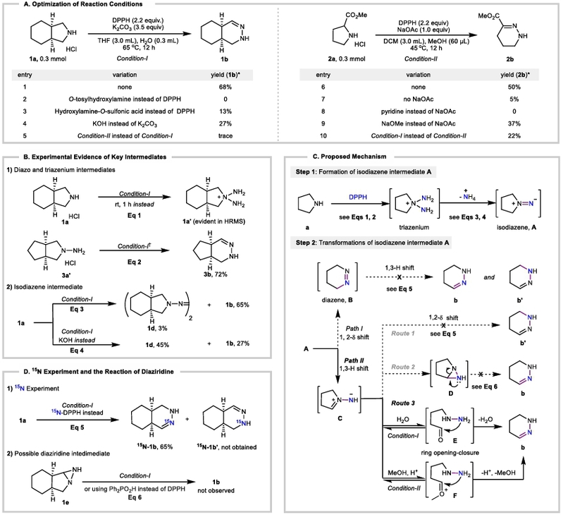 研究团队通过对反应进行系统性的条件筛选,确定了最佳反应条件:对于取代的吡咯烷底物顺式全氢异吲哚1a在条件(DPPH,K2CO3,THF/H2O,65 °C,12hr)下能以68%核磁收率得到插氮产物1b(图2A);后续通过关键中间体的监测、15N标记等实验巧妙地论证出了反应的机理(图2C)。