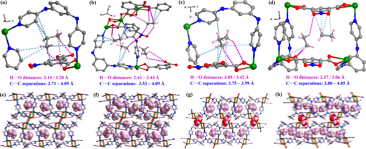 图3. 分别吸附乙烷和丙烷气体分子的晶体结构分析。