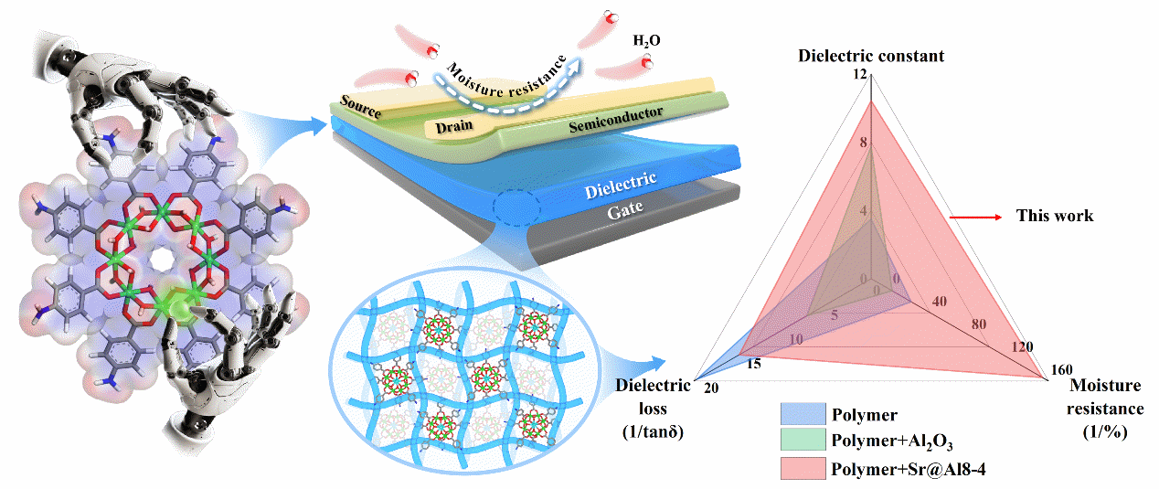 场效应晶体管作为微电子技术的核心,在电子器件领域具有广泛的应用前景。构建具有高介电常数、低介电损耗和良好环境稳定性的聚合物复合介电材料对于提升场效应晶体管的性能和可靠性至关重要。然而,传统的高介电常数掺杂材料如Al2O3、TiO2和高极性聚合物等,仍然存在界面粗糙、易团聚、兼容性不足、损耗高和湿度敏感等问题。由此产生的器件吸湿效应不仅会导致介电性能不稳定,而且阻碍了聚合物复合界面上载流子运输机制的理论研究。