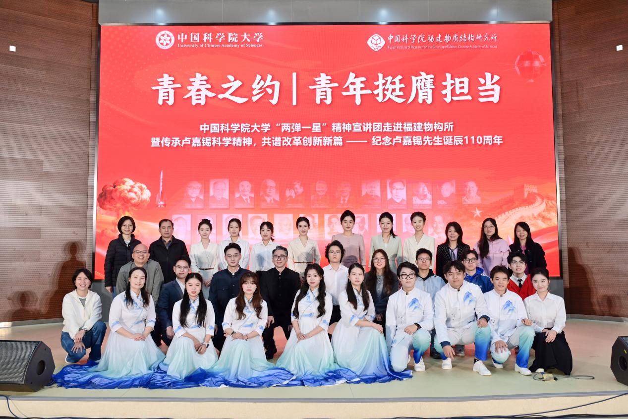 1121日,中国科学院大学(以下简称“国科大”)“两弹一星”宣讲团走进中国科学院福建物质结构研究所(以下简称“福建物构所”),开展了一场别开生面的“青春之约”专题宣讲。本次活动由国科大团委、福建物构所教育处、研究生会共同主办,所党委书记、副所长张健,国科大团委书记陈睿,教育处人员及300余名师生代表出席活动,共同见证这场青春之约,以青春对话信仰,共同打造“科教融合”思政大课堂。