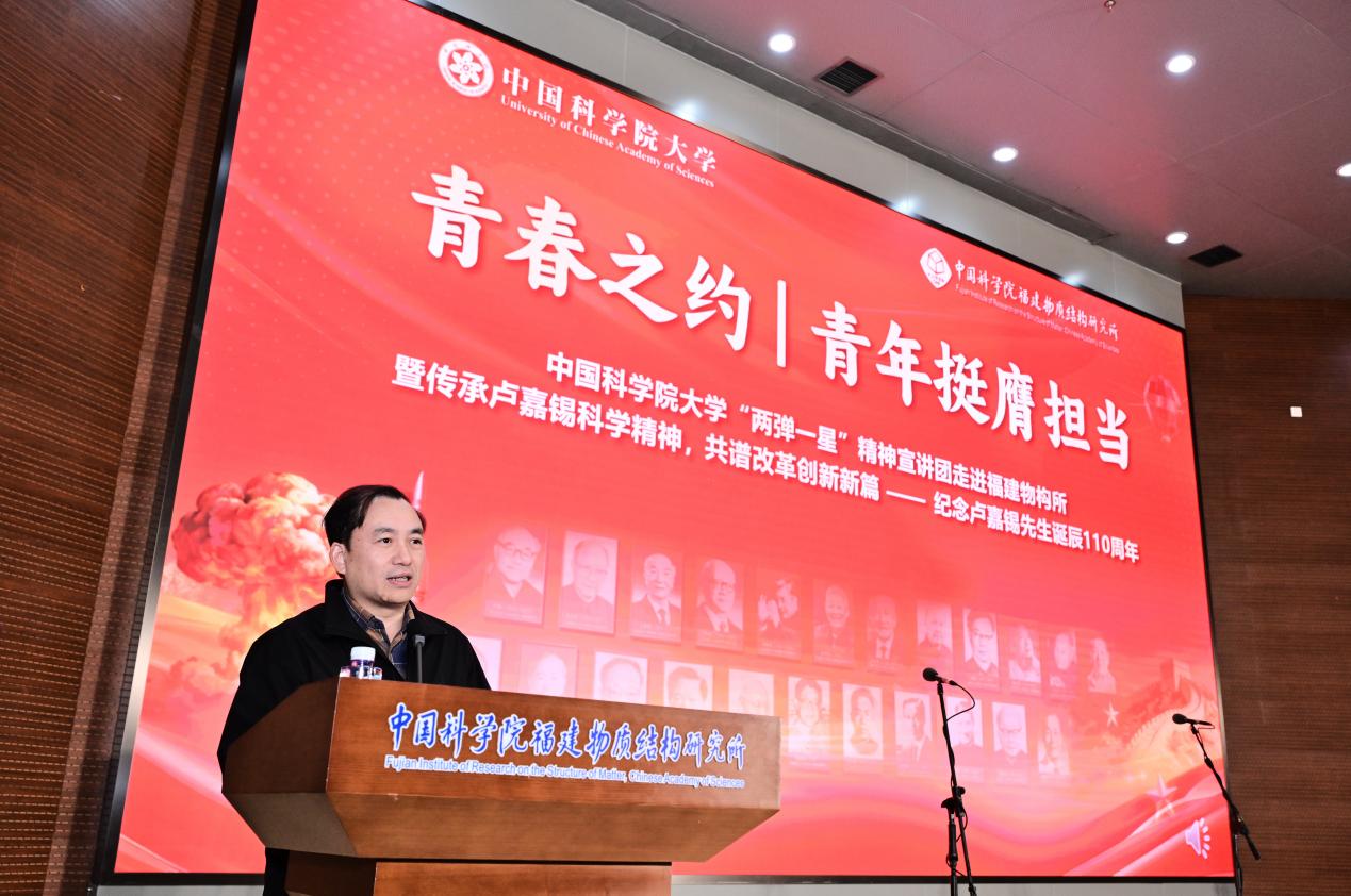 11月21日,中国科学院大学(以下简称“国科大”)“两弹一星”宣讲团走进中国科学院福建物质结构研究所(以下简称“福建物构所”),开展了一场别开生面的“青春之约”专题宣讲。本次活动由国科大团委、福建物构所教育处、研究生会共同主办,所党委书记、副所长张健,国科大团委书记陈睿,教育处人员及300余名师生代表出席活动,共同见证这场青春之约,以青春对话信仰,共同打造“科教融合”思政大课堂。